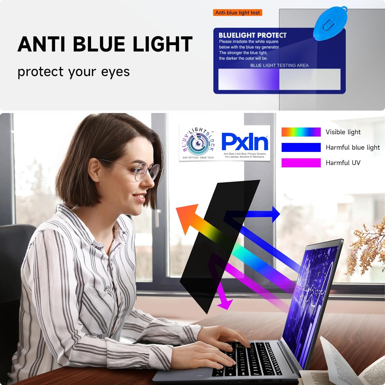 A: It blocks blue light and reduces harsh glare, preventing eye fatigue from prolonged laptop use.